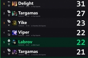 体育资讯3月25日讯 外媒统计数据,先锋赛历史辅助选手单场比赛助攻数排行:Delight 31个第一。