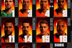 1-维尔布鲁根、3-范黑克、4-范戴克、8-赫拉芬贝赫、11-加克波、14-赖因德斯、15-范德芬、18-马伦、20-库普梅纳斯、21-斯米特、22-邓弗里斯