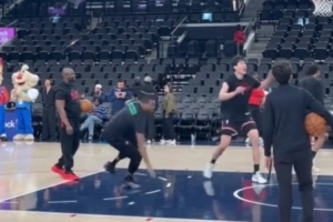 体育资讯4月1日讯 NBA常规赛,开拓者卡位战客场114-104击败快船。赛前有镜头捕捉到杨瀚森在热身时撞倒了黑人助教。